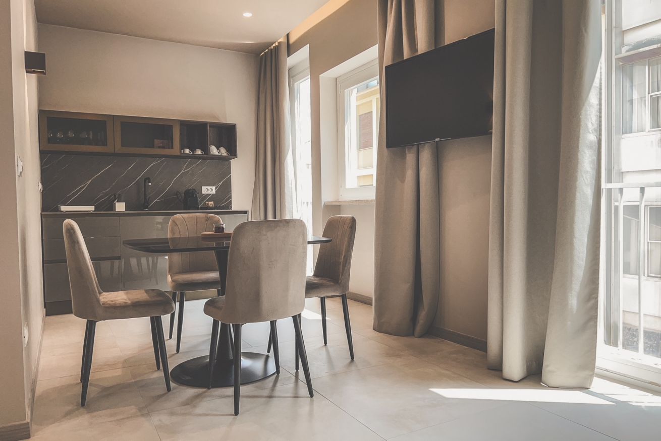 -Cucina essenziale per pasti veloci, con piano cottura, lavello, mini-frigo, macchina da caffè e bollitore. Non adatta a chi cerca una cucina completamente attrezzata o intende cucinare pasti elaborati.